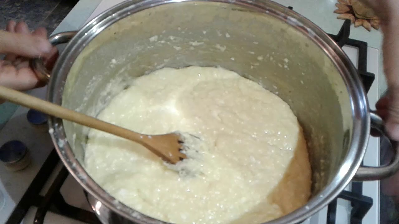 В кипящее молоко добавить яично-сметанную смесь. Еще раз плавно перемешать массу и довести до кипения. Во время процесса в емкости начнет появляться сыворотка.