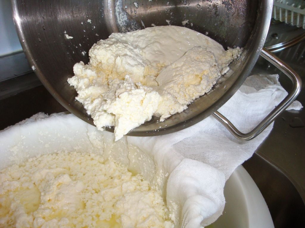 Сформировать из ткани мешочки и разложить по ним сырную массу. Придать сырной массе в мешке форму шара (чем ровнее, тем лучше будет выглядеть сыр), затем повесить мешок над раковиной и дать ему стекать на протяжении 30 минут. За это время подогреть оставшуюся сыворотку до 50°С.